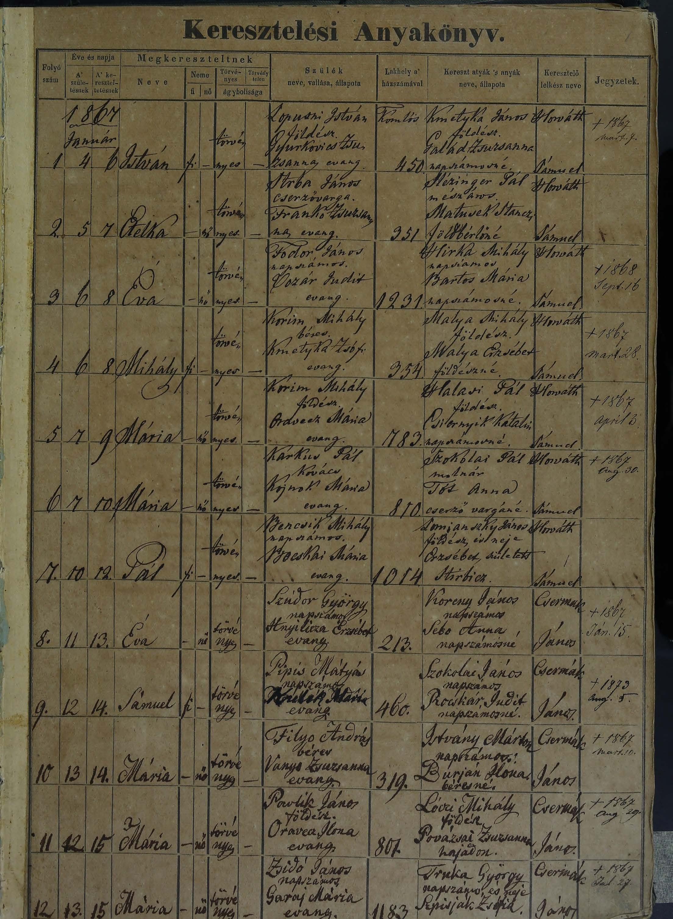 záznam z roku 1867 (v maďarčine)