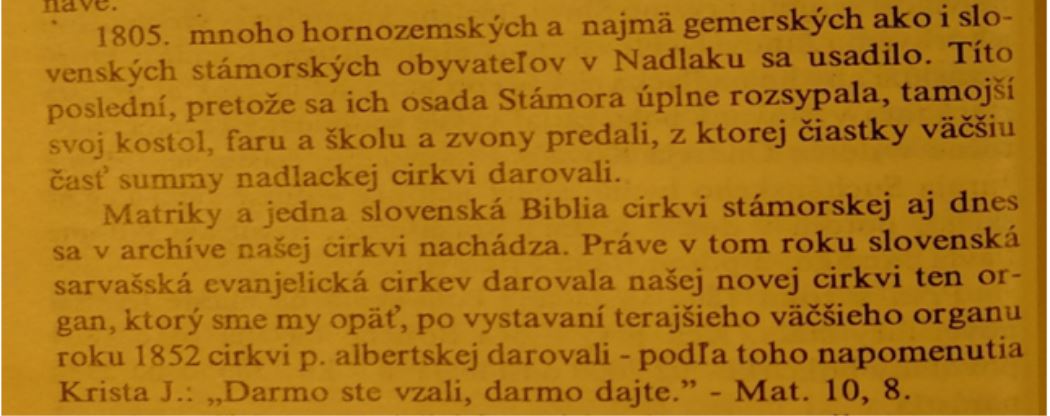V druhom odseku sa píše, že Slováci zo zaniknutej obce Slovenská Stamora prišli do Nadlaku s matrikami a jednou slovenskou Bibliou – a tieto sa nachádzajú v archíve cirkvi Nadlackej. Tak snáď neboli zničené, keďže sa zachovali aj cirkevné matriky mesta Nadlak, je nádej, že aj matriky Slovenskej Stamory budú nájdené v archívoch.