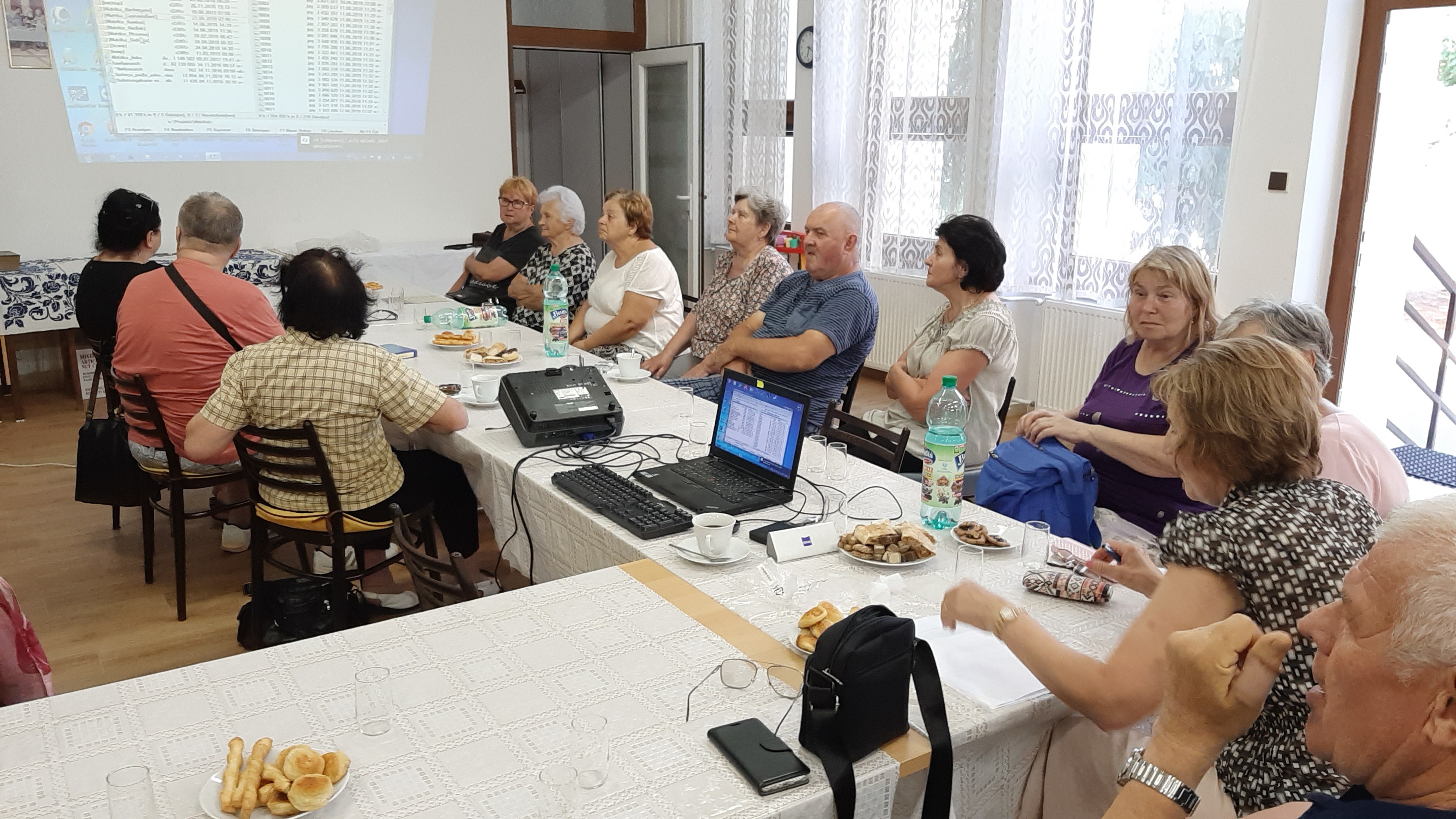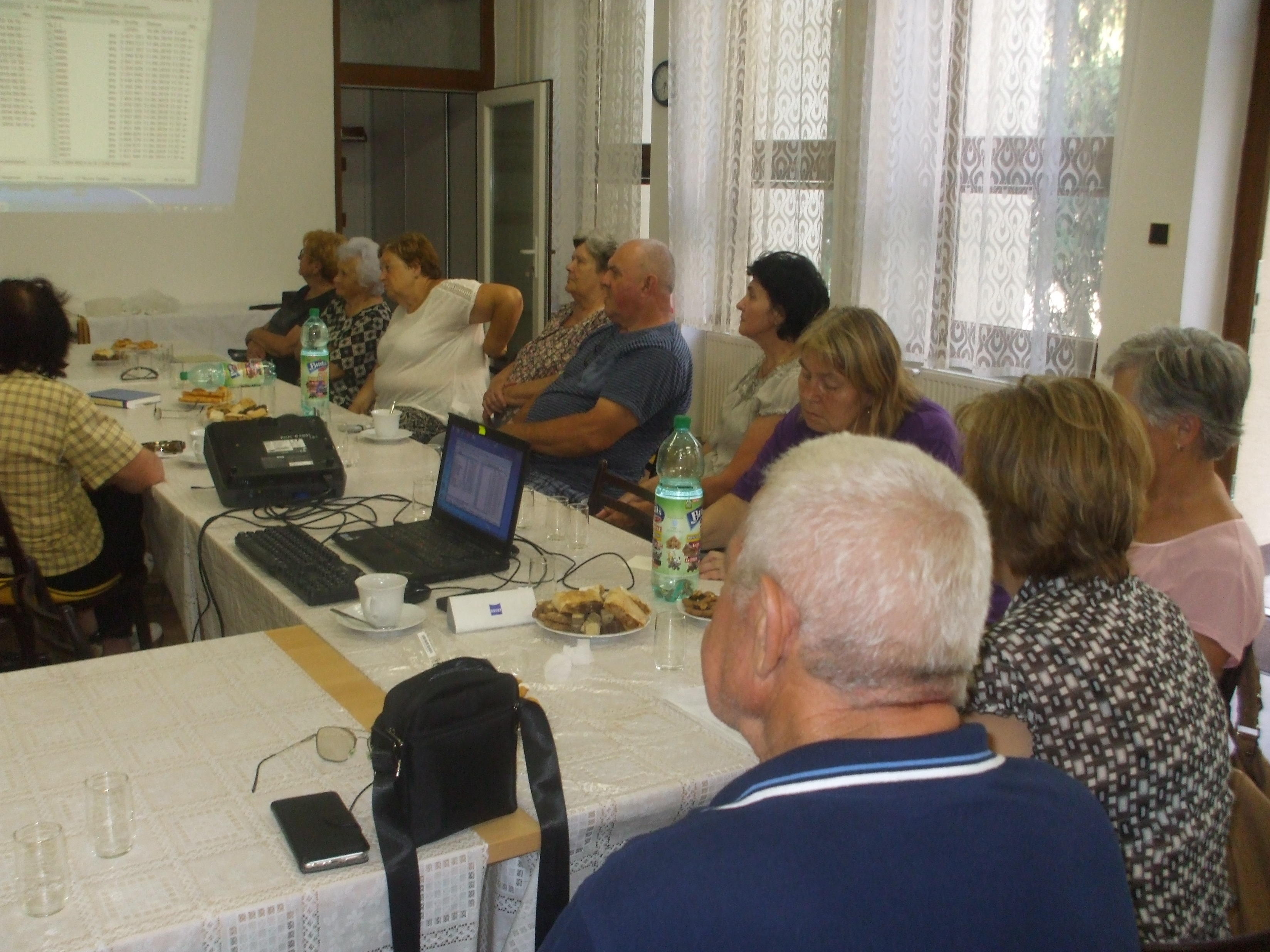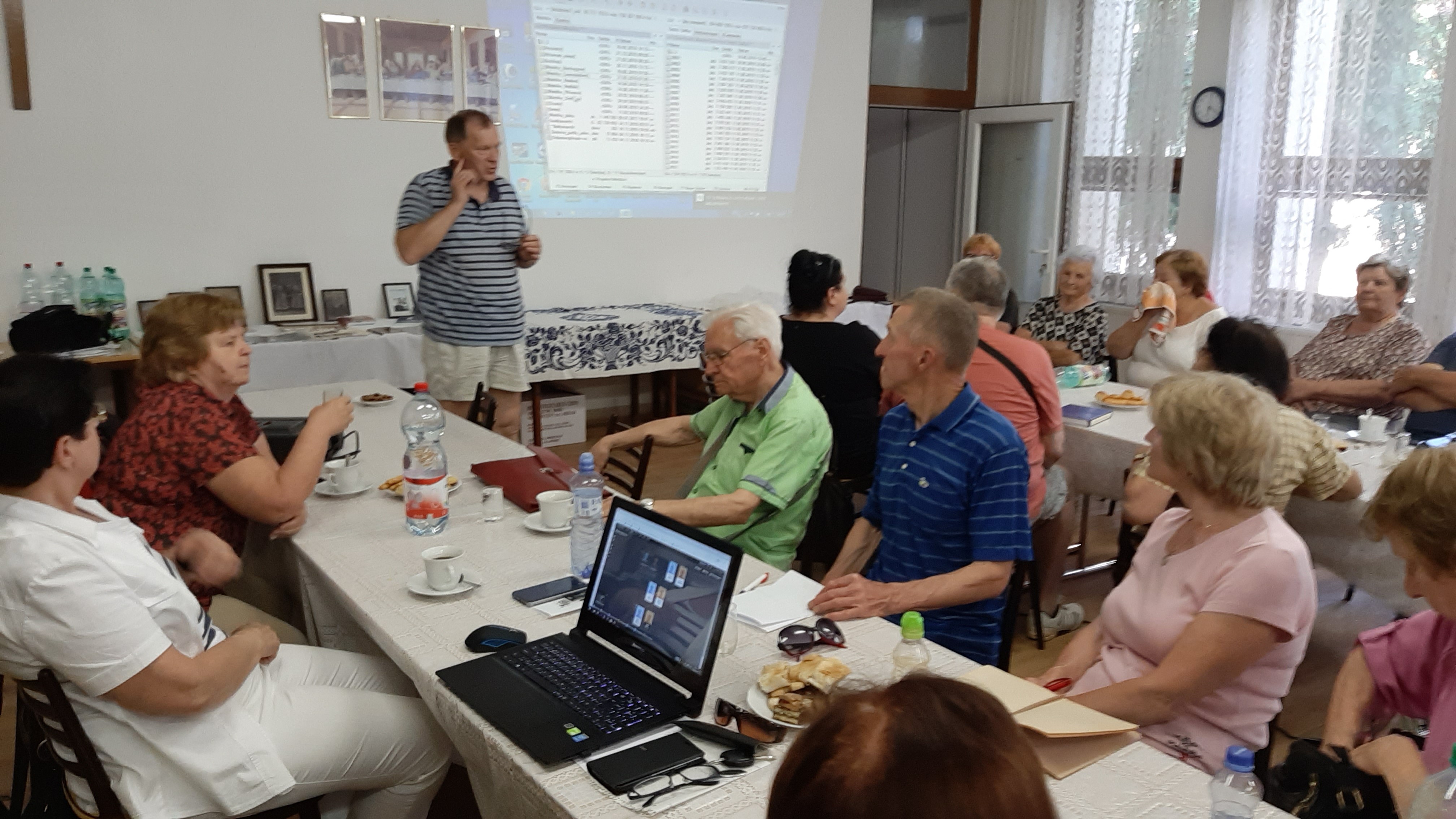 Zišli sa tu nielen potomkovia dolnozemských rodín zo Slovenského Komlóša, z Bánhedešu a Nadlaku, ale aj pezinčania, ktorí sa venujú genealógii. V prvej časti prednášky sa prítomní dozvedeli čo presne robíme, videli ako vyzerajú pôvodné matričné záznamy a ako ich prepisujeme do našej databázy. Prednášajúci, Ing.Ľubomír Kmeť, predviedol niekoľko štatistík vyplývajúcich z našich záznamov, aké mená sa najviac vyskytovali v matrike krstov, najfrekventovanejšie priezviská, či už na Komlóši, alebo V Bánhedeši. Na grafoch mohli vidieť aký vplyv mali niektoré udalosti na obyvateľstvo, či už to boli epidémie cholery, alebo vojny, hlavne 1.svetová. Boli oboznámení v akom stave sú práce na jednotlivých projektoch.