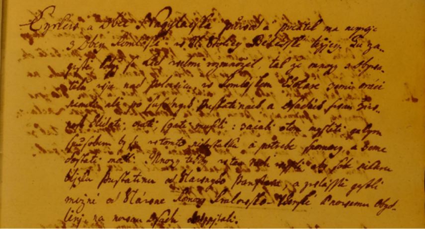 Prepis: Cyrkev a Obec Nagylacka púvod a počátek má nejvíce z Obcy Komlošske v Stolici Bekešske ležicy. Tu zajiste bolyž se Lid veľmi rozmnožil, tak že mnogý z obivatelu, vjec nad polovicu, v Komlošskem chotare zemi oráci nemeli, ale po susednych pustatinách a osadách stam živnost hledati, osáti, siati museli : začali o tom mysleti jakym spusobem by si v tomto nedostatku a potrebe spomocy, a zeme dostati mohli. Mnozy tehdy v tom radu našli, aby sobe ..... blizku pustatinu od Slavnyho panstva, a z..... jestli možné od Slávne Komory Kralovsko-Uherské k novému obydlení na novem Osadu boly pítali . ...